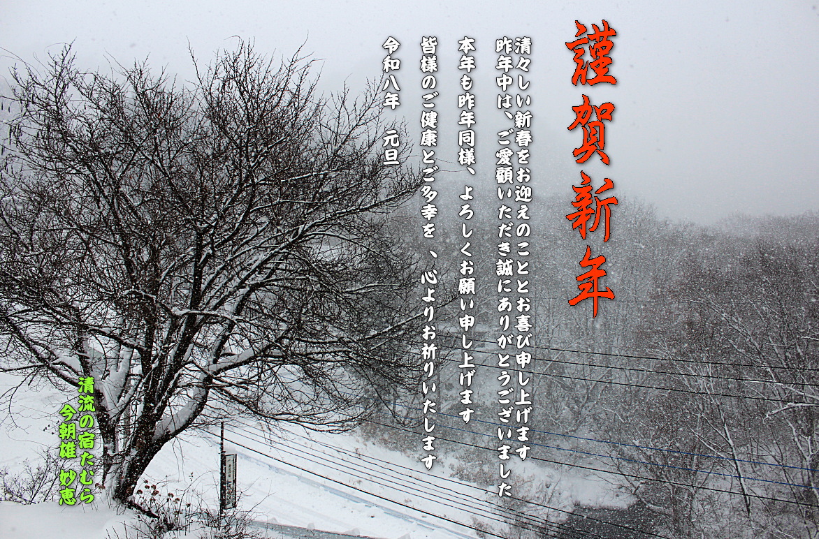 🌳あけましておめでとうございます 🌳昨年は、たむらをご愛顧いただき誠にありがとうございました❤ 今年もあいかわらず、よろしくお願いいたします。 湯の小屋温泉、現在の気温は、-3℃。 雪❄が舞っています🐎 2026-01-01 お知らせ, お知らせ, 清流の宿たむらより